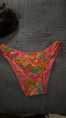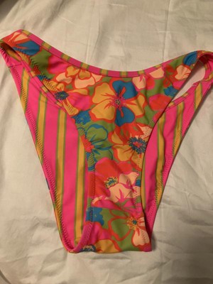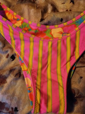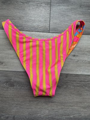 Women's Reversible Contrast Binding Mid-Rise High Leg Cheeky Bikini Bottom - Wild Fable™ Floral Print/Pink Striped X: Nylon Spandex Blend