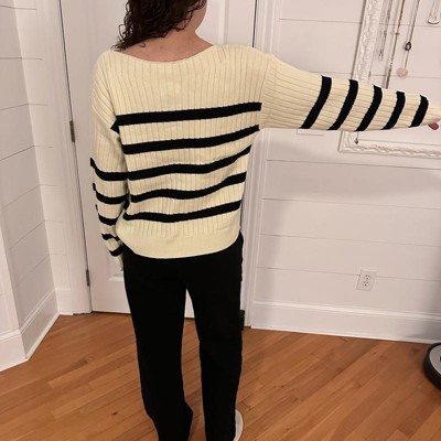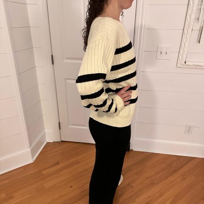 [This review was collected as part of a promotion.] I ordered this sweater for myself in a size medium. I’m 5’7” and typically wear a medium in my tops. I like the striped pattern and the colors of the sweater. The fabric is comfortable and soft. I’m not impressed with the neckline of the sweater. My bra strap shows, so I’d have to wear a strapless bra and there’s really no structured hem around the neck, it just looks unfinished. The fit is fine, though a bit boxy on me. Just not a flattering sweater.