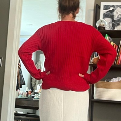 [This review was collected as part of a promotion.] I wear a size small sweater. I have a 32 inch waist and a 36 inch chips. This size small sweater fit me very well. I absolutely loved the fit and feel of the sweater. The neck line on the sweater was very unique and beautiful. The red color of this sweater is perfect for the holidays. The sweater can be easily dressed up or dressed down.