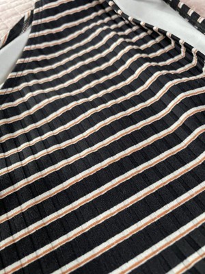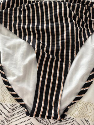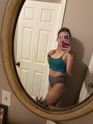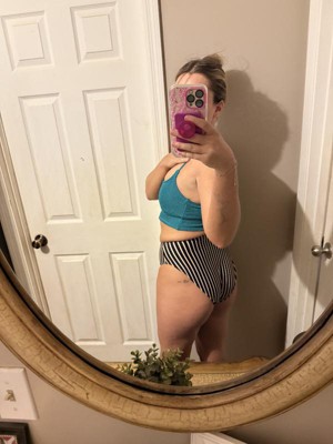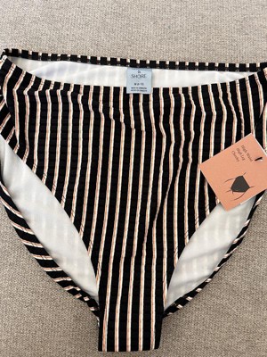 These high waisted high leg cheeky bikini bottoms by Shade and Shore gives you a retro vibe. They have horizontals ribbed lines with white and orange vertical stripes. I am a size 27 and size medium fits perfectly.