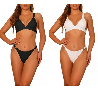 Specification:1. Material: 95% polyester, 5% elastane.2. Color: Black & White, Rose Red.3. Size: XS, S, M, L, XL.4. About Padding Cups: With removable padded cups.5. About Underwire Type: No steel ring.6. Package Contents: 2 * Bikini Sets.7. Cleaning Method: Machine wash cold gentle with like colors. Non-chlorine bleach. When needed, tumble dry low, remove promptly. Iron low.
