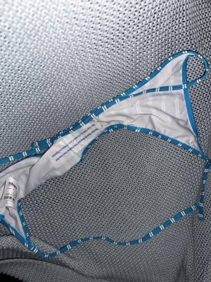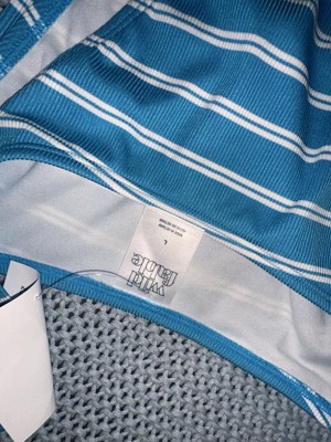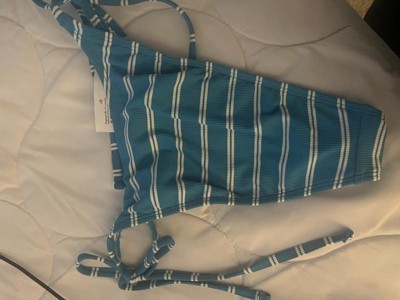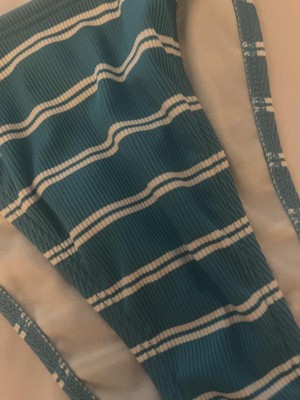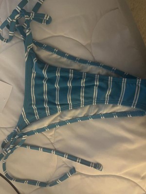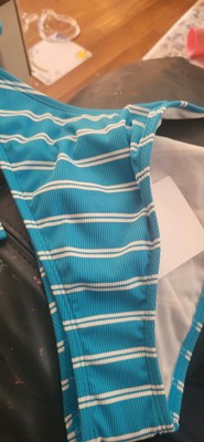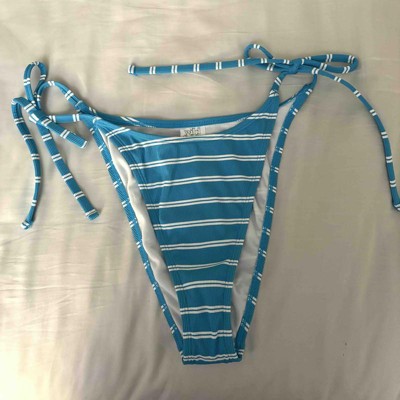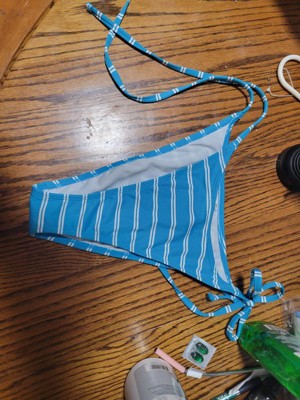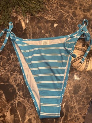 Ribbed bikini bottom from Wild Fable™ features teal and white striped pattern. Made of recycled polyester fabric with spandex and full lining for flexible comfort all through your activities. Low rise, ultra high-leg design bikini bottom provides super cheeky coverage. Side ties for a secure, customizable fit.