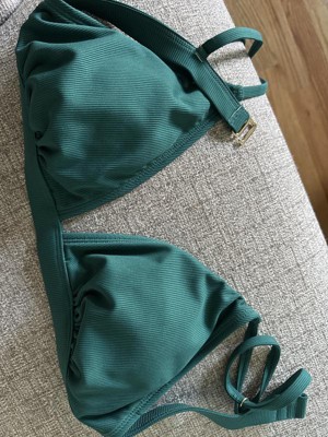 This forest green colored triangle top ribbed bikini top is comfortable with no underwire. The strap is adjustable like a bra and the back is adjustable too with 3 hook hole position. The strap buckles and back hook is gold which is nice with the green. The bikini has padded inserts. The ribbed design is more of a tightly ribbed texture instead of being spaced out. Size M (8-10) is accurate, it is for 34 C/D and 36 B/C. This is a nice color will match well with identical bottom or black bottom.