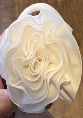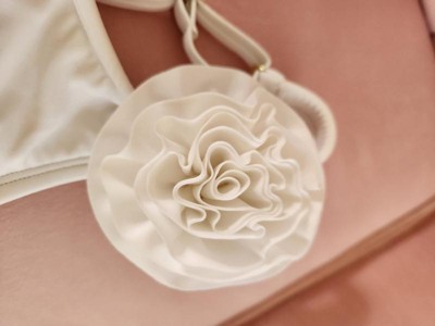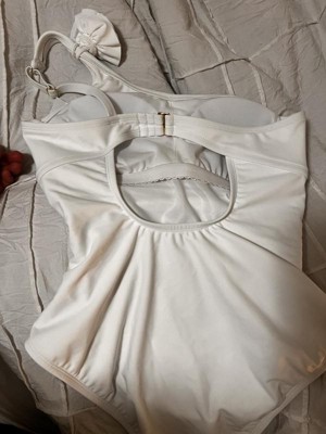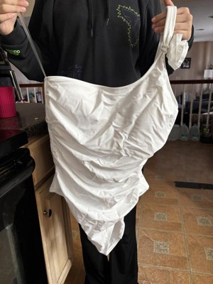 This bathing suit has a really cute design. I love the rosette detail on the shoulder. The material is silky and smooth and is great for swimming. I was hesitant about getting a white swimsuit but this is thick enough, even when wet, to not show anything. There are removable pads in the chest and extra material to keep it from being see-through. I like that the swimsuit has a one shoulder design and that it is adjustable to fit. The only thing I'm not crazy about is that this has very significant ruching on the side which almost makes it fit smaller than it should. So be aware that it definitely runs a little on the smaller side.