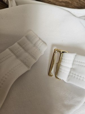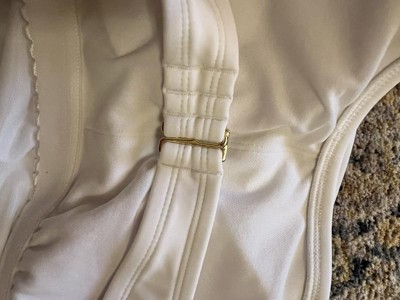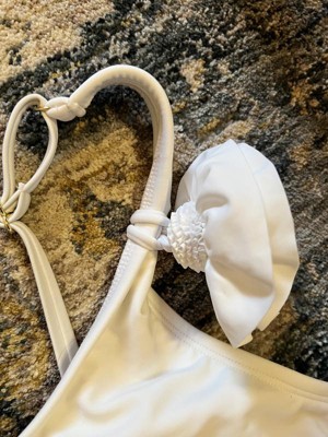 So stunning and stylish with a one shoulder rosette. The white color is always classic for the beach. It does have a back strap with adjustable hook across the back. Very comfortable, legs are higher cut.