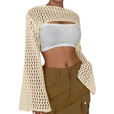 Women's Round Neck Crochet Knit Shrug Stylish Cropped Top Cardigan for Casual Layering Apricot S