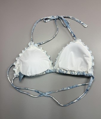 Shade & Shore™ Women's Ruffle Edge Toile Print Triangle Bikini Top is made from nylon tricot fabric with spandex and recycled polyester lining. It this has a toile print and ruffled detailing around the edges. It features removable padding for customizable coverage, while the behind-the-neck and back ties provide an adjustable fit. The four-way-stretch design and opaque sheerness help keep you comfortable in and out of the water. It fits true to size and provides adequate support for a tie biking top.