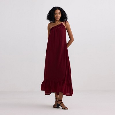 A: The dress features a ruffled one-shoulder design and a stylish slit.