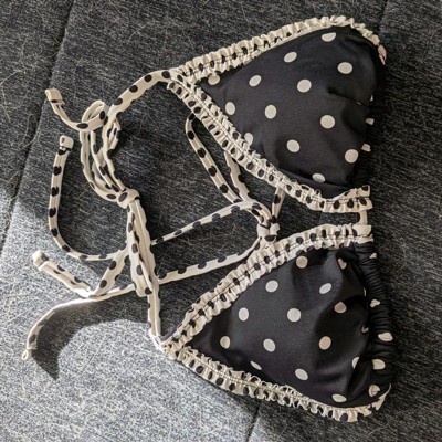Tricot triangle bikini top from Wild Fable™ adorned with polka dots and ruffle-trim edges. Made from nylon fabric with spandex and full lining for flexible comfort in and out of the water. Adjustable back and behind-neck ties complete the look and provide a customizable fit. Sizes X-3X feature fully adjustable X-back and tie closure and additional under-bust support.