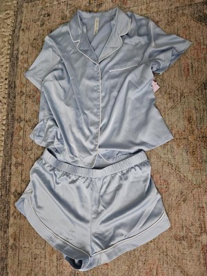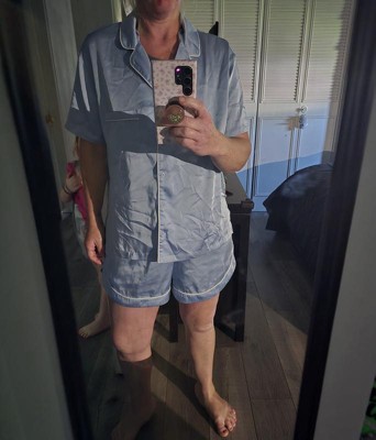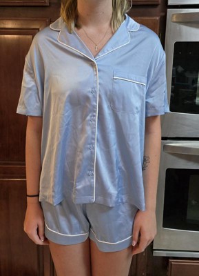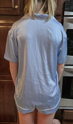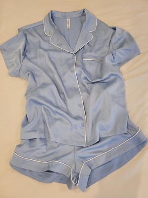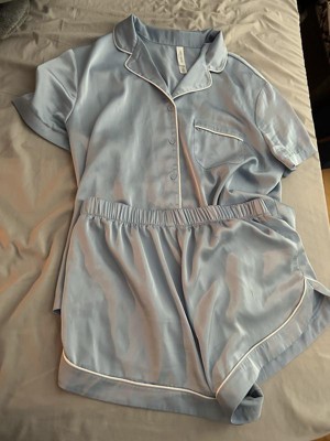 Women's Satin Short Sleeve Notch Collar Shirt and Shorts Pajama Set - Wild Fable™ Blue 1X