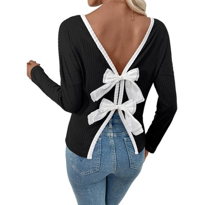 Women's Shirt Ribbed Long Sleeve Top Open Back Bow Pullover