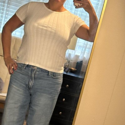 [This review was collected as part of a promotion.] I am five feet tall, have a bra size of 34 DD, and tried on the size medium in this short sleeve pointelle t-shirt from Universal Thread. I love the fit of this shirt a lot and would say it fits true to size. The material is so soft and comfortable- I have a feeling this will be my new go to shirt. I really like the neckline a lot and just overall think the shirt is pretty flattering. Great price for a nice new addition to my casual wardrobe.