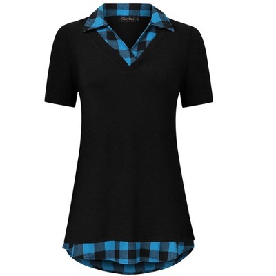 - FEATURES - Stylish Fake Shirt Collar/Short Sleeve/V Neck/2 in 1 Design/Contrast Color/Layered Look/Curved Hem/Patchwork/Slim fit/Good Stretchy/Work Shirts/Casual Blouse Tops.Unique style, make you look more romantic and elegant.