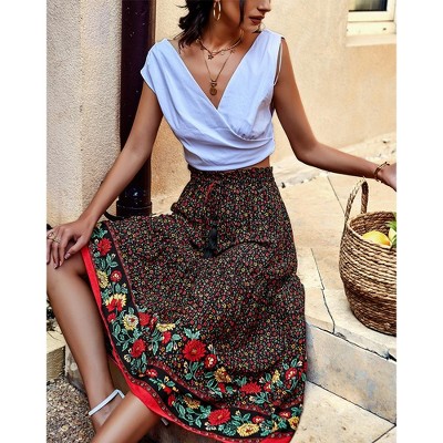 Women's Simple Ruffled Wave-Edge Bohemian Maxi Skirt, Flowy A-Line Long Skirt for Beach Vacation & Casual Outings Black S