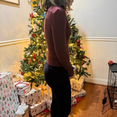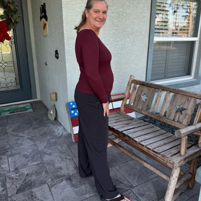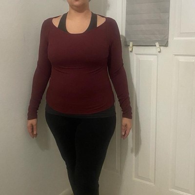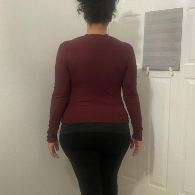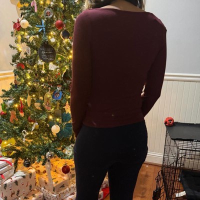 [This review was collected as part of a promotion.] I was very pleased with the quality of this piece. It has a wide boat neck. I love the color which is very popular right now. The ribbon gives it some nice texture. The shirt has a lot of stretch in it. I feel like you could size up if you wanted it to fit more loosely. Or you can size down if you want this to be more snug because, perhaps, you want to wear it under other things. I think it's versatile in that regard. You can either wear it alone or as a base underneath something else. My daughter is wearing the size small in the color burgundy.