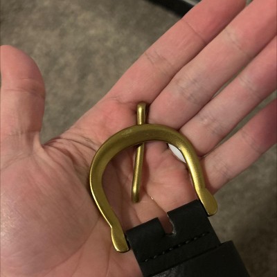 A: The belt features a horseshoe-shaped buckle with gold-tone hardware for added shine.