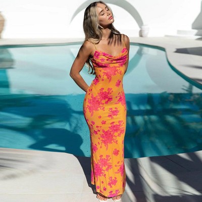 Women's Spaghetti Strap Backless Long Dresses Flower Printed Slim Fit Dress