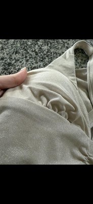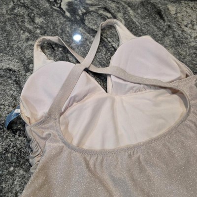 This swimsuit caught my eye one several Target trips, but I never wanted to try it on because most one pieces really disappoint me as a pear shaped gal. However, I really couldn’t resist the pretty blue shimmer, and I’m so glad I decided to finally try it! Most swim bottoms give me the dreaded quadrabutt — you know, when the elastic creates a lovely four-cheek effect where it cuts into your ample derrière. And in a one piece, this is accented by loose and gaping cups. Not this one! This swimsuit fits my top and my behind *perfectly*! That would have been enough for me, but the plunge neckline and ruching down the front are the cherry on top. I’ve never, ever been happier with a suit in my life! I wish it came in more colors with the shimmer effect. I’m reliably a 12-14 in bottoms from Target brands, and a medium on top, and this suit fits perfectly.