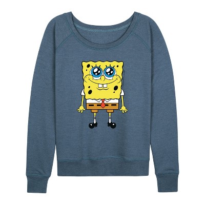 Women's SpongeBob Squarepants Spongebob Happy St Patricks Day Lightweight French Terry Wide Neck Long Sleeve Graphic Shirt - Heather Indigo - Medium
