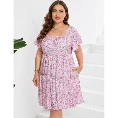 Women's Spring Summer Floral Sundress, Square Neck Sleeveless Fitted Flared Mini Dress Pink L