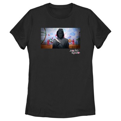 A cool baseball-style card of the elusive Front Man from Squid Game is featured on the front of this cool new Women's Graphic T-Shirt from the thrilling TV series.