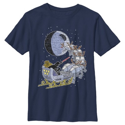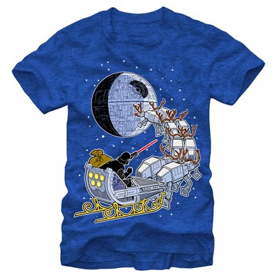 Christmas would sure be different if Vader brought the gifts! Picture this alternate reality with the Star Wars Darth Vader Santa's Sleigh Heather Royal Blue Racerback Tank Top. This blue Star Wars Christmas shirt shows Darth Vader sitting in a sleigh as eight AT-ATs with antlers pull him towards the Death Star.