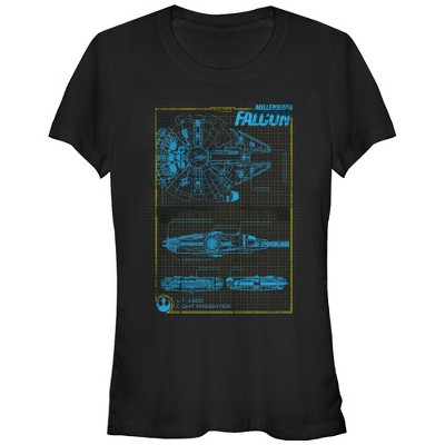 Fly into Star Wars Episode VII at epic speeds with the Star Wars Millennium Falcon Blueprint Black T-Shirt. The blueprints of the famous spaceship flown by Captain Han Solo and Co-Pilot Chewbacca are printed on the front of a cute black Star Wars Episode VII tee.