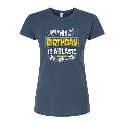 Star Wars - This Birthday Is A Blast - Women's Short Sleeve Classic Fit Tee - Embark on an epic adventure with our officially licensed Star Wars graphic apparel collection! Celebrate the legendary saga with bold, iconic designs featuring your favorite characters, ships, and moments from a galaxy far, far away. Whether it's the fearless Luke Skywalker, the powerful Darth Vader, the wise Yoda, or the unforgettable Millennium Falcon, each piece captures the magic and excitement of the Star Wars universe. From graphic tees and hoodies to sweatshirts, this collection combines comfort with striking artwork that showcases the timeless appeal of the Star Wars story.