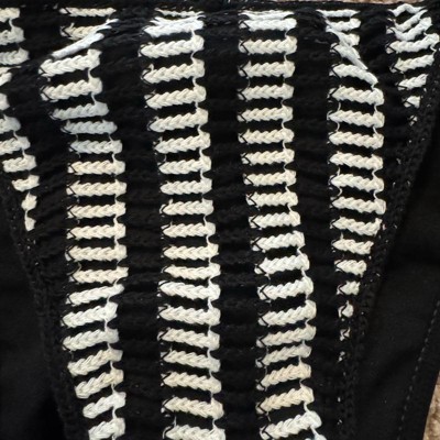 [This review was collected as part of a promotion.] These side tie bikini bottoms fit accurately for their description as “low rise high leg extra cheeky”. I ordered my usual size, large, and they fit true to size however the coverage in the back was more minimal than I prefer. The striped crochet pattern is cute on the front. The back is plain black material.