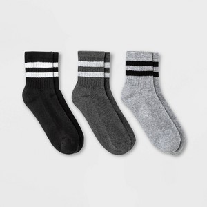 A: The socks are made of 77% cotton, 15% polyester, 5% nylon, and 3% spandex.