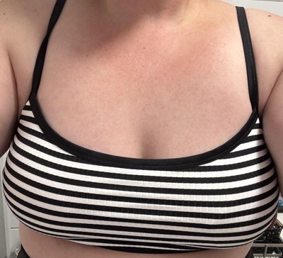 This is a very soft, ribbed, striped thin strapped bralette top. It wears similarly to a sports bra. It doesn’t have a lot of support built in. The fabric is comfortable on and should be nice as a swimsuit top