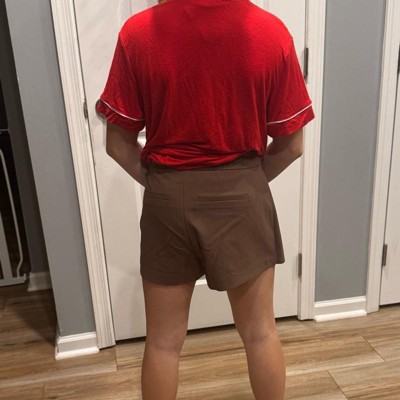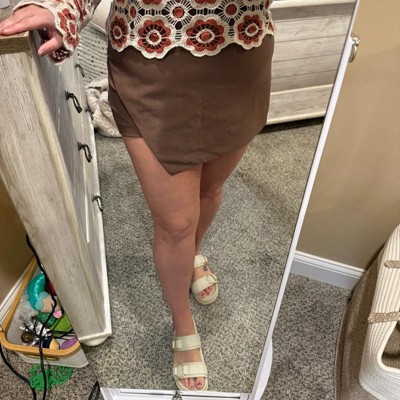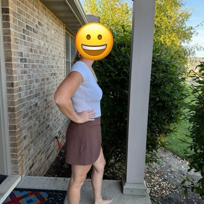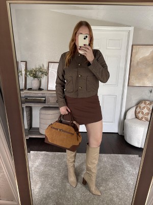Cute, on trend skort! Love how it comes with shorts underneath. On the shorter side for sure, so if you are tall it might be too short. It was just on the cusp for me at 5 feet 6. Adore the brown color and paired it with another Target find, this plaid jacket. Skirt size M on me. I shared how I styled it over on my Instagram @affordablebyamanda — I post affordable outfit ideas and Target fashion finds there! 💕