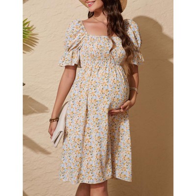 Women's Summer Boho Floral Print Dress Vintage Square Neck Ruffle Swing Flowy Beach Long Maxi Dress Yellow X-Large