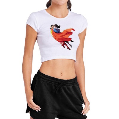 Women's Superman 2025 Superman Lois Shield Cap Sleeve Baby Rib Crop Top, White, Small