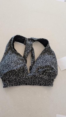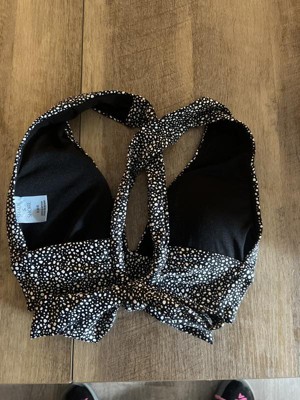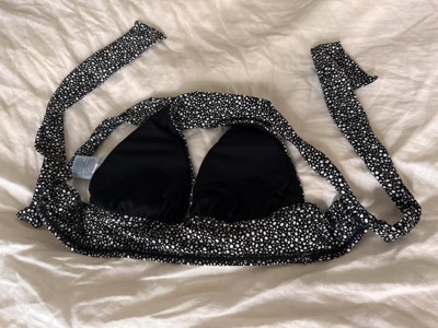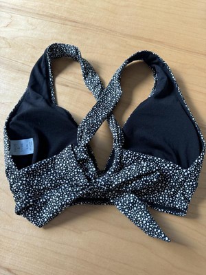 I love this tall triangle top! Has such a cute cross over tie in back and nice coverage as well. Can totally be adjusted by loosening or tightening the cross over ties. Has removable pads and a nice stretch to the material.