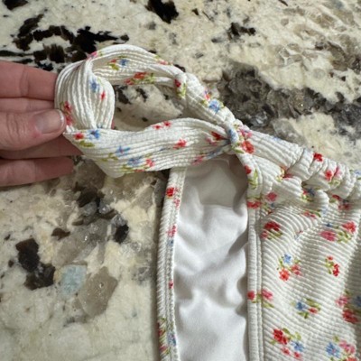 [This review was collected as part of a promotion.] These bikini bottoms are from the brand wild fable. They are photographed in a size large or a size 12 to 14. These run true in size. These have a stretchy waistband and go up super high on your waist. The back of the bikini bottoms is very high-rise and cheeky. If you are looking for more coverage, these probably aren’t the ones for you. The material is a cream or off-white color with a fun trendy floral design.