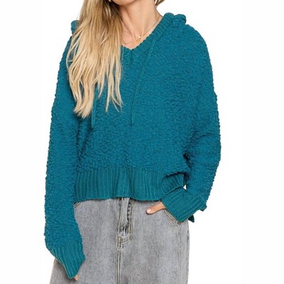 Whether you're running around town or lounging at home, this sweatshirt works for both.This hoodie sweater is designed with a relaxed oversized fit, featuring a V-neckline, a hood with an adjustable tie, knitted weave band detail on the high-low hem, and long banded sleeves. Perfect for casual looks with jeans or dressed-up vibes with skirts. Measurements: Small Bust 52", Length 22", Medium Bust 54", Length 22", Large Bust 56", Length 22", XL Bust 60", Length 28", 2XL Bust 62", Length 28", 3XL Bust 64", Length 28". The back is longer. Made from 80% polyester and 20% acrylic. Hand wash cold.