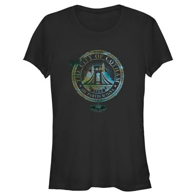 The citizens of Gotham City never need fear as long as this officially licensed DC Comics The Batman style is around! This Womens' Tee portrays a seal with "The City of Gotham" and "Sic Parvis Magna" printed around the center. Don't leave Gotham in the dark and get this tee today!