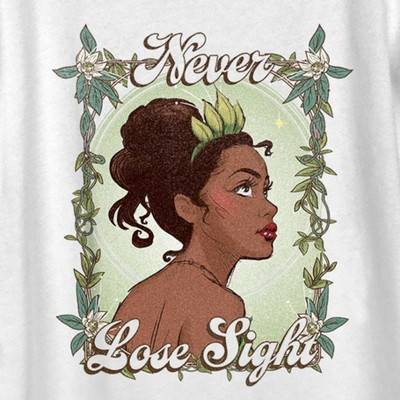 Kissing a frog doesn’t seem so bad if you end up with the officially licensed Disney The Princess and the Frog Tiana Never Lose Sight Women's Graphic Scoop Neck T-Shirt. This tee features Tiana framed by flowers in a sketch art style and the text: "Never Lose Sight." All of your favorite characters are here to help add some magic to your closet with these fun designs, perfect for Disney fans everywhere!