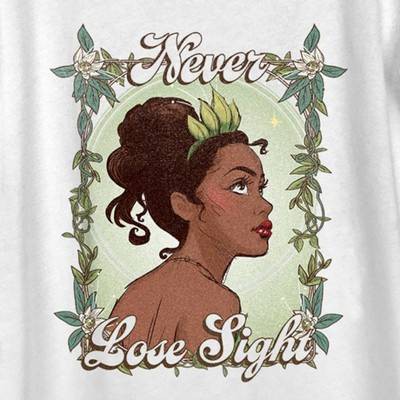 Kissing a frog doesn’t seem so bad if you end up with the officially licensed Disney The Princess and the Frog Tiana Never Lose Sight Women's Graphic Scoop Neck T-Shirt. This tee features Tiana framed by flowers in a sketch art style and the text: "Never Lose Sight." All of your favorite characters are here to help add some magic to your closet with these fun designs, perfect for Disney fans everywhere!
