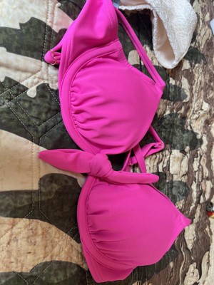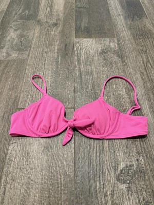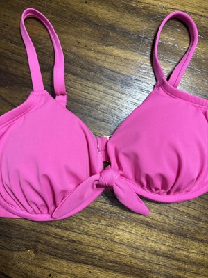 This women's front knot underwire bikini top is very cute. I love the style of the knot at the center and the color of pink. The size does run small so I would size up next time. The style is comfortable and the straps stay in place better than ties.