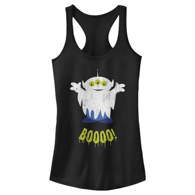 The Little Green Men are all dressed up for Halloween in this adorable Juniors' Racerback Tank Top, from Pixar's Toy Story, featuring one of the aliens dressed as a ghost with "Boooo!" in dripping green letters underneath.
