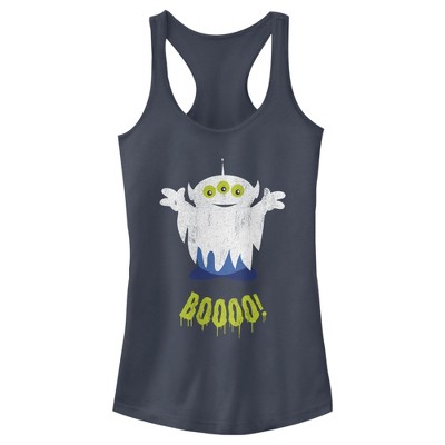 The Little Green Men are all dressed up for Halloween in this adorable Juniors' Racerback Tank Top, from Pixar's Toy Story, featuring one of the aliens dressed as a ghost with "Boooo!" in dripping green letters underneath.