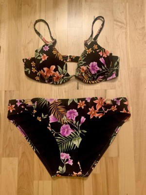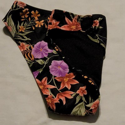 Beautiful and comfortable! I absolutely love the bright, vibrant colors on the various florals and how they contrast against the black. A sleek, stylish and classy look. It is hipster cut with good coverage on the back. I have an hourglass figure and I like how the cut fits on me. There are two gold colored metal rings on each side. The material is soft with plenty of stretch. Overall happy with this bikini bottom. Thank you!