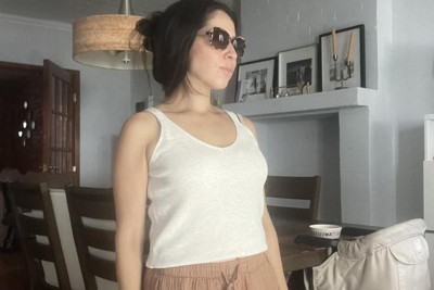 The oatmeal color & medium thickness of these sweater tanks is PERFECTION! I will wear them with shorts unt I can transition this to jeans/pants in the fall. Again- highly recommend. I also reached up so you can see these aren't cropped. For reference, I am 114 lbs, 34B, and petite (5'1)