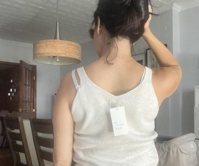 Flattering tank. I bought every color. I normally think spaghetti straps are juvenile but this one is more classy with the sweater texture. I like that can wear a regular bra with it and still have it somewhat cover bra straps. Size M fit great . Size B cup / 133lbs/5’4” if that helps !