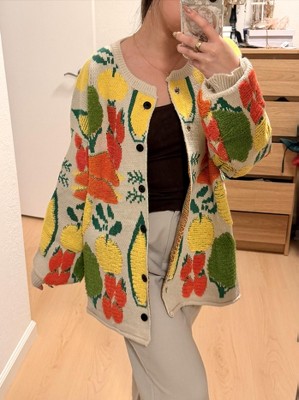 To preface, I am* returning the cardigan, but it doesn't deserve such negative reviews. It's just a standard drop-shipped item, but it does look like the photos in my opinion! It was my bad for ordering a size up, I was just scared the cardigan looked too fitted on the model and I wanted it to be cozy and oversized. Definitely don't size up, it's already too big. Some of the fruits with the "3-D" raised chenille thread had some pulls (see sleeve in the photo) but other than that it looked fine to me! An obvious dupe for some boutique options out there. I don't plan on reordering but the S is sold out anyway so we'll see if I change my mind.