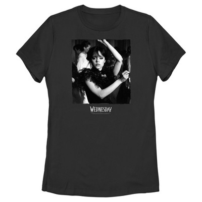 Join Wednesday Addams, the death-obsessed daughter from the iconic Addams Family franchise as she attends Nevermore Academy, hones her psychic abilities, and solves age-old mysteries in the spine-chilling new series Wednesday from Netflix! This officially licensed Wednesday Dance Scene Logo Women's Graphic T-Shirt features a large graphic of the iconic Wednesday dance scene printed across the front along with the series' logo below. Get some new Wednesday designs and embrace the darkness!
