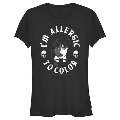 • Strut your stuff with this stylish new everyday women's t-shirt that is perfect for every occasion! Featuring Wednesday Addams' face encircled by text: "I'm Allergic To Color," along with two skulls!