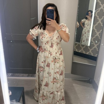 From casual outings to holiday evenings, this Western Puff Short-Sleeve Smocked Midi A-Line Dress from Universal Thread™ is a perfect choice for casual occasions. Made of 100% cotton, this midi A-line dress offers all-day comfort. It features a sweetheart neckline with front ties and has a smocked bodice to help you find the right fit. Designed with short puff sleeves, it's finished with a ruffled hem for a graceful look.
